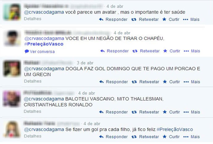 As mensagens do Twitter, colocadas com a hashtag #PreleçãoVasco, ficaram expostas para o público. Entre elas, há muitos incentivos aos jogadores, misturados com cantadas, cornetadas de rivais e xingamentos. Entre os jogadores, Thalles é quem mais recebeu elogios, como "negão de tirar o chapéu". Luan foi outro bem elogiado, assim como Martín Silva, que teve até versos da música "Por onde andei", de Nando Reis, endereçados a ele.