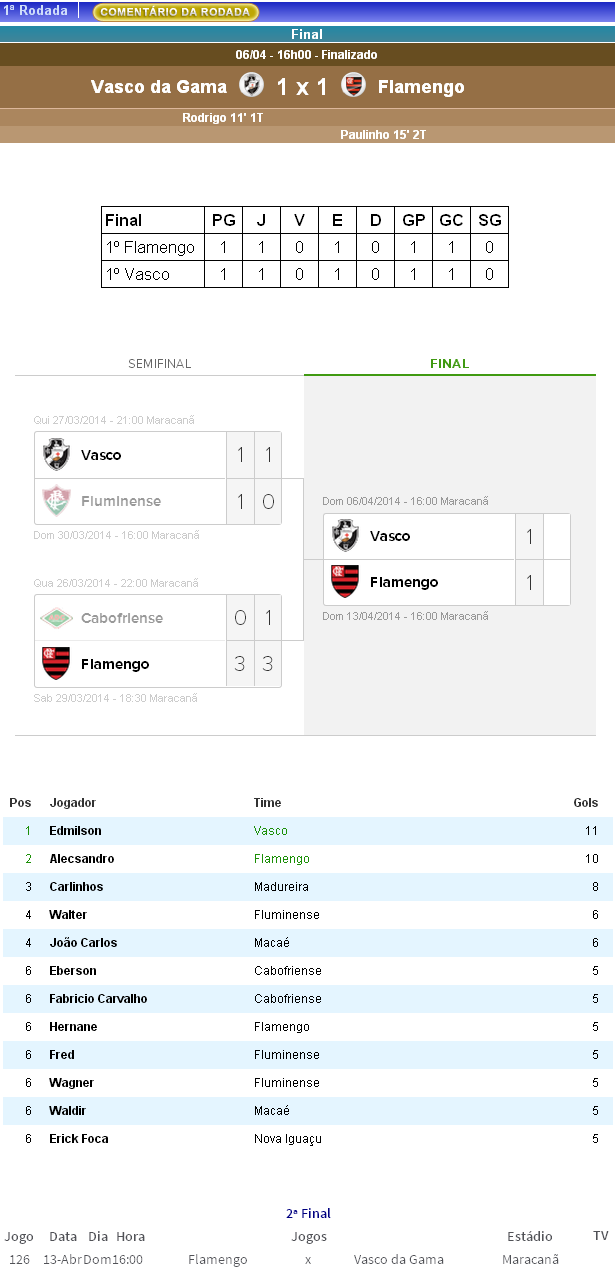 Terminada a 1ª rodada das finais do Campeonato Estadual, o Vasco, que empatou com o Flamengo por 1 a 1, não conseguiu inverter a vantagem do rival e agora terá que vencer o 2º jogo se quiser ser campeão. Ao Flamengo, bastará o empate para ficar com o título. Não haverá, em hipótese nenhuma, decisão por pênaltis.