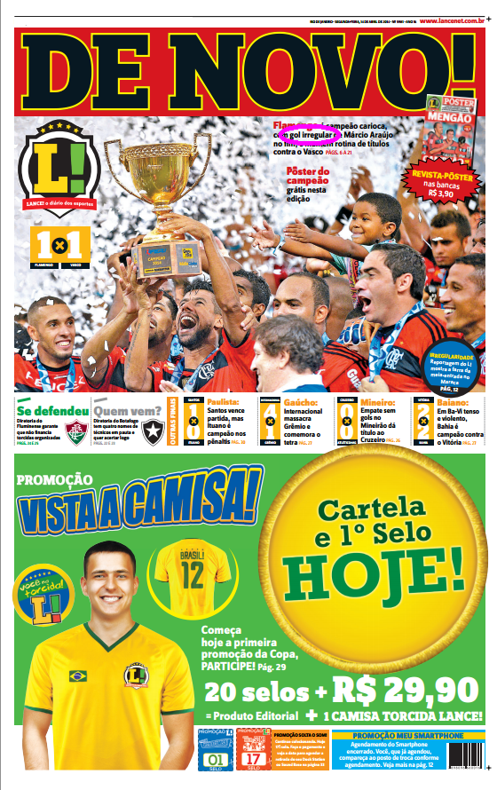 Lance! - Não destacou o gol irregular na manchete. Informou, em letras pequenas, na capa: "Flamengo é campeão carioca, com gol irregular de Márcio Araújo no fim, ..."