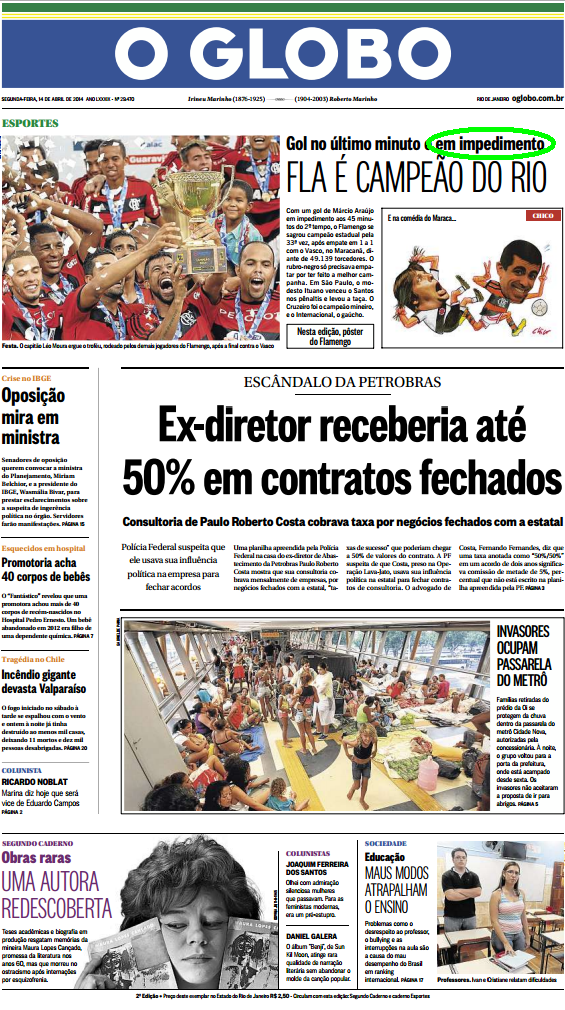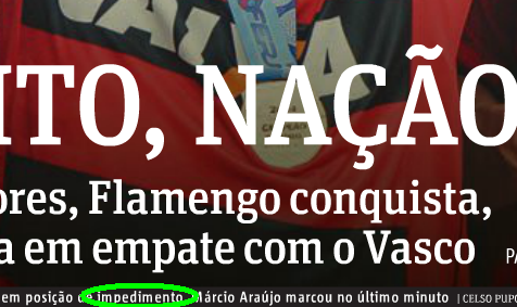 O Globo - Não destacou o gol irregular na manchete em si, mas publicou, em letras de tamanho médio, em local de destaque, acima da manchete: "Gol no último minuto e em impedimento"