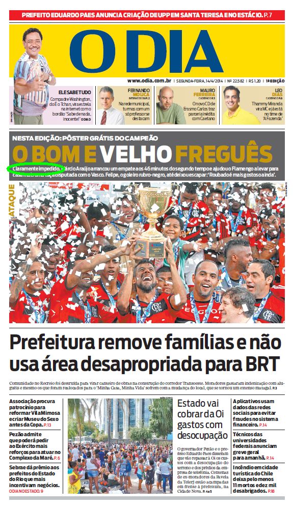 O Dia - Não destacou o gol irregular na manchete. Informou, em letras pequenas, na capa: "Claramente impedido, Márcio Araújo arrancou um empate aos 46 minutos do segundo tempo..."