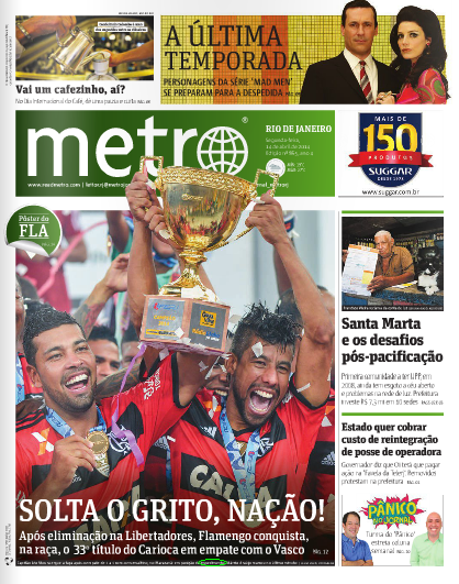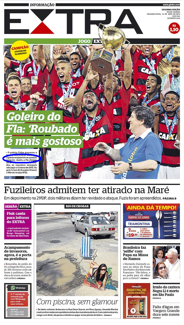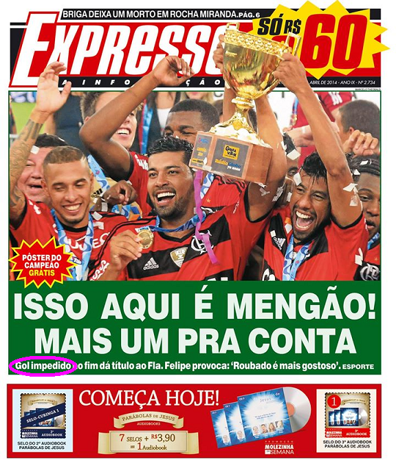 Extra - A manchete escolhida ("Goleiro do Fla: Roubado é mais gostoso") dá a entender que o título foi ganho de forma irregular, mas não detalha a situação. Informou, na capa, em letras pequenas: "O goleiro Felipe provocou a torcida vascaína ao saber que o gol de empate foi em posição irregular."
