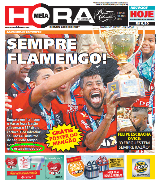 Meia Hora - Não destacou o gol irregular na manchete. Informou, em letras pequenas, na capa: "Gol salvador saiu aos 46 minutos do segundo tempo com Márcio Araújo, que estava impedido"