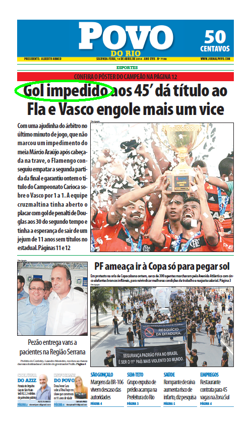 Dos 10 jornais cariocas que informaram sobre a decisão do Estadual em suas capas, apenas 2 destacaram, na manchete, o caráter irregular do gol que deu o título ao Flamengo no empate por 1 a 1 com o Vasco: O Globo e Povo do Rio. Um deles (RJsports, que é o antigo Jornal dos Sports) não fez nenhuma menção à ilegitimidade do gol que decidiu a competição. Os 7 restantes informaram somente em letras pequenas que o gol rubro-negro foi irregular.