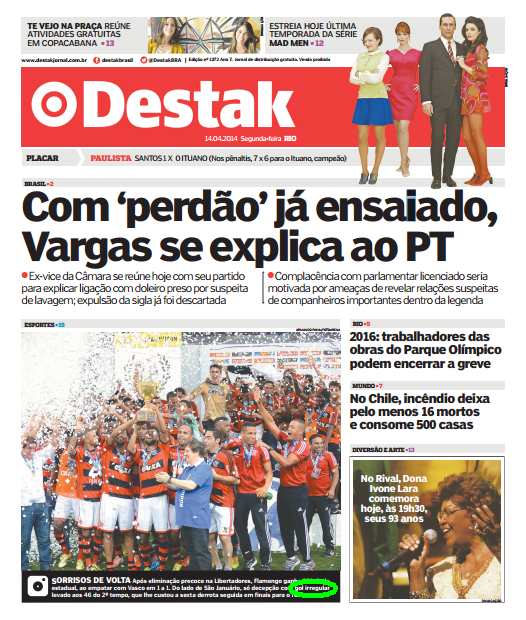 Destak - Não deu manchete para a decisão. Publicou somente uma foto, sem título, informando na legenda: "Do lado de São Januário, só decepção com gol irregular levado aos 46 do 2º tempo..."