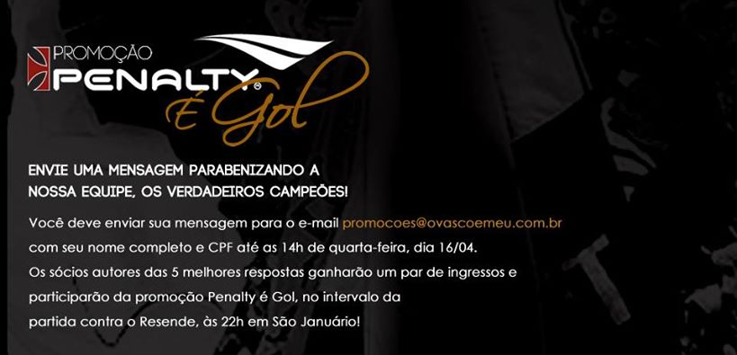 Os sócios autores das 5 melhores respostas ganharão um par de ingressos e participarão da promoção Penalty é Gol, no intervalo da partida contra o Resende, às 22h em São Januário!