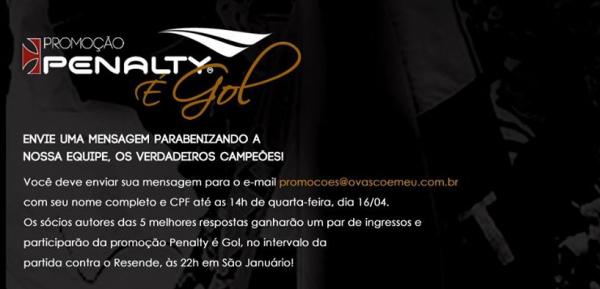 Participe da promoção 'Penalty é gol' e concorra a ingressos para a partida entre Vasco e Resende nesta quarta (16/04), às 22h, em São Januário. Além de concorrer, os vascaínos terão a chance de bater as penalidades no intervalo do jogo decisivo.
