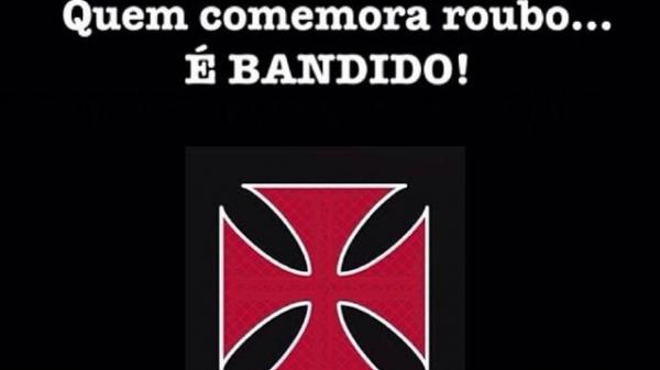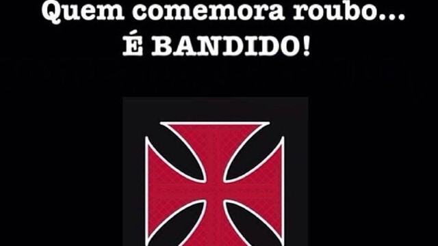 Na imagem, a frase “Quem comemora roubo ... é BANDIDO” aparece no símbolo do clube pedindo respeito.