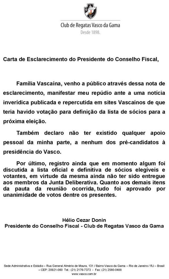 Cruzada Vascaína divulga nota acerca do parecer do Conselho Fiscal sobre as contas de 2012 do Vasco