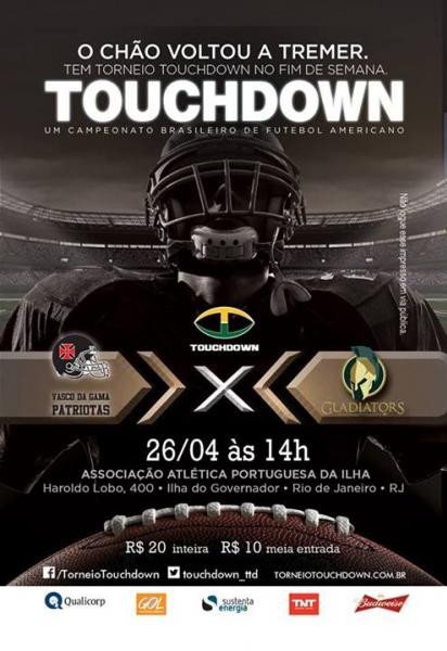 A grande torcida do Vasco da Gama Patriotas, que integra a Conferência Norte do Torneio Touchdown, vai finalmente poder assistir à estreia de seu time no próximo sábado, dia 26, às 14h, no Estádio da Portuguesa da Ilha do Governador. O advesário será o Juventude Gladiators/RS, da Conferência Sul. O Vasco vem lutando pela conquista de um título inédito, que já lhe escapou noutras oportunidades. Os ingressos vão custar R$ 10 (inteira) e R$ 5 (meia entrada, com camisa do Vasco).