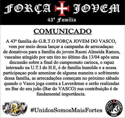 Força Jovem 43ª Família recolherá donativos para vascaíno baleado no Amapá a partir deste sábado