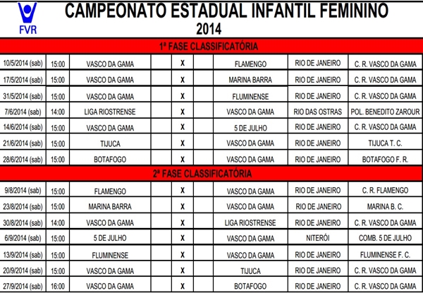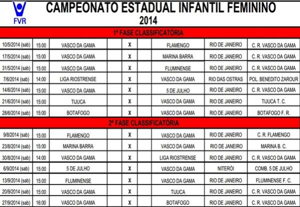 O Vasco já sabe qual será o seu cronograma de jogos no Campeonato Estadual de vôlei de base do Rio de Janeiro. O primeiro desafio do time infantil será contra o Flamengo, no dia 10 de maio, às 15h00, no Ginásio do Forninho, em São Januário.