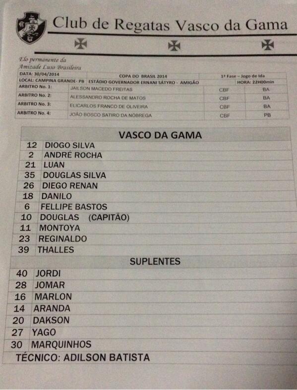 Confira escalação oficial do Vasco; Douglas Silva e Danilo são titulares