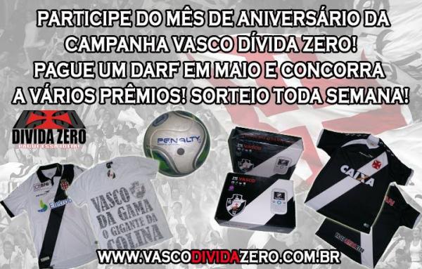 Maio é o mês de aniversário da campanha Vasco Dívida Zero e além de ajudar o Vascão você pode concorrer a muitos prêmios! Pague um DARF e a cada R$20,00 você concorre com um cupom eletrônico ao sorteio de vários brindes! Camisas, Bola, Celulares entre outros! Inclusive uma camisa oficial com a marca da campanha Vasco Dívida Zero que não é vendida em lojas! Fiquem ligados na nossa Fanpage, no nosso site e no VDZTV que rola toda terça as 20:30h no canal oficial no Youtube! Toda semana teremos sorteios e após o pagamento do DARF o seu cupom concorre o mês todo! Ou seja, quanto antes você pagar, mais chances de ganhar!