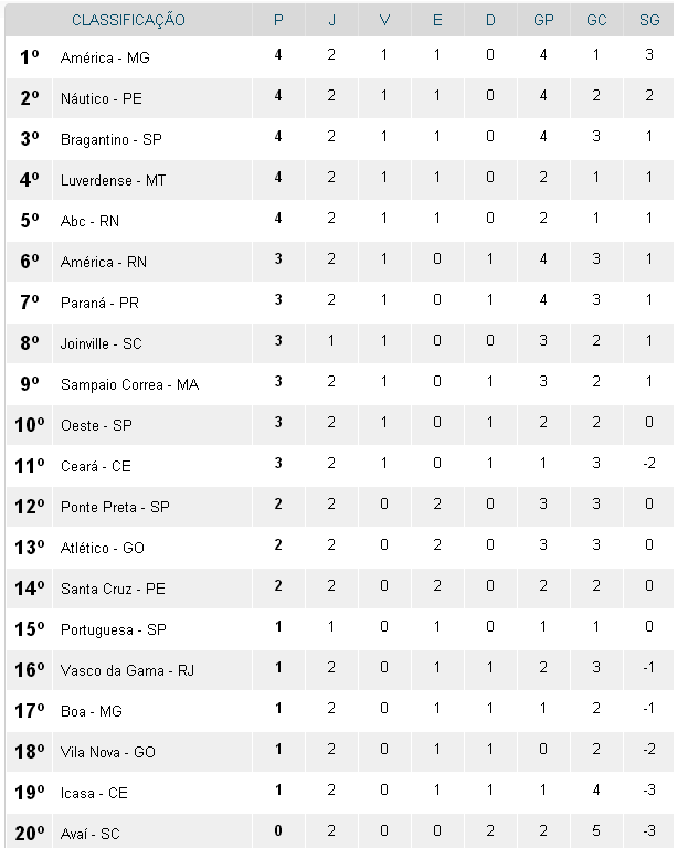 Confira a classificação do Brasileiro da Série B após 2 rodadas (o jogo Joinville x Portuguesa não foi realizado):