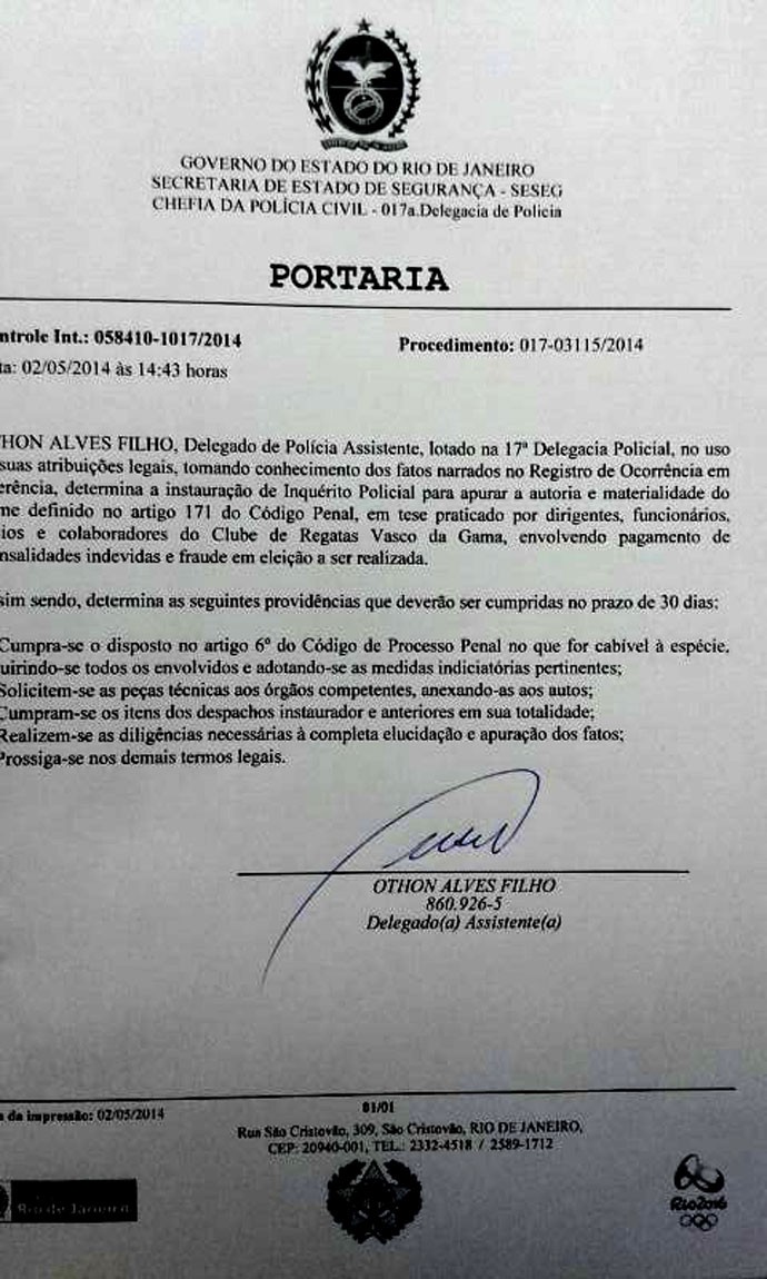 Segundo pedido do Ministério Público, o inquérito policial vai apurar “a materialidade do crime definido no artigo 171 do Código Penal, em tese praticado por dirigentes, funcionários, sócios e colaboradores do Club de Regatas Vasco da Gama”. O GloboEsporte.com teve acesso aos primeiros documentos da investigação policial. A polícia vai recolher as fichas cadastrais que estão sob posse da comissão de sindicância vascaína e anexar ao processo.