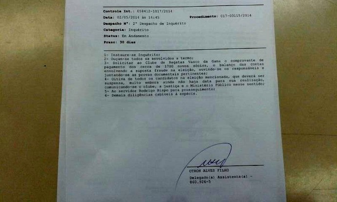 As eleições do Vasco agora são, definitivamente, caso de polícia. A 17ª Delegacia de Polícia de São Cristóvão abriu inquérito nesta sexta-feira e já mandou suspender o processo eleitoral do clube, que ainda não tem data definida. A polêmica remete à entrada de mais de três mil associados no mês de abril de 2013. O delegado-assistente Othon Alves Filho ouviu dois depoentes - o candidato Nelson Rocha, autor da queixa-crime ao Ministério Público - e o grande benemérito do Vasco, Otávio Gomes, que denunciou ao GloboEsporte.com em setembro do ano passado a prática de candidatos ao pleito presidencial vascaíno. Além disso, o presidente do clube Roberto Dinamite e o vice-geral foram intimados a depor. A polícia também vai ouvir Eurico Miranda e Roberto Monteiro, pré-candidatos à presidência do Vasco.