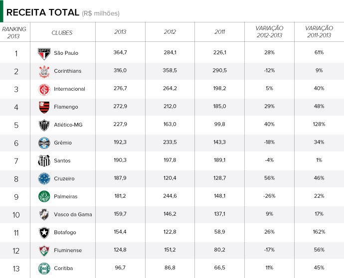 A venda de Lucas para o Paris Saint-Germain, da França, tirou do São Paulo um jogador que começava a se tornar ídolo da torcida. Mas os R$ 87,2 milhões arrecadados com a negociação foram determinantes para o Tricolor ultrapassar o Corinthians e assumir o posto de clube com maior receita do futebol brasileiro em 2013, com um total de R$ 364,7 milhões arrecadados contra R$ 316 milhões do rival. O ranking foi elaborado pelo consultor de marketing e gestão esportiva Amir Somoggi, que teve como base o balanço financeiro de 2013 das agremiações. A reportagem foi atualizada com o Vasco, que divulgou os números com atraso. O Atlético-PR, que não divulgou o documento, não foi incluído.