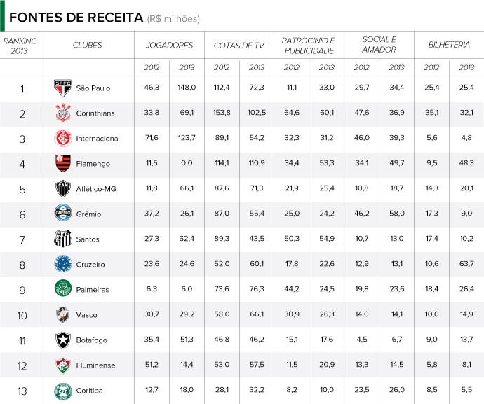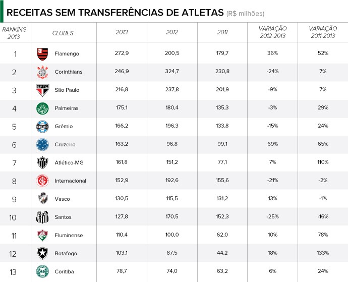 O Flamengo, quarto colocado no total, lidera nas receitas quando são retiradas da soma as vendas de jogadores, com R$ 272,9 milhões. O número aponta um crescimento de 36% em relação a 2012, impulsionado pelo grande número de sócios, pelo aumento na verba recebida pelos patrocinadores e também pelo dinheiro arrecadado na bilheteria, que pulou de R$ 9 milhões para R$ 48 milhões.