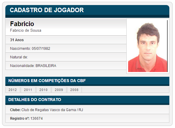 O volante Fabricio, recém contratado pelo Vasco, está registrado no BID, da CBF. Com isso, o jogador já está apto para atuar pelo Vasco. Confira abaixo as informações: