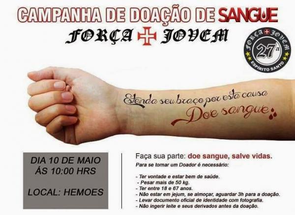 FORÇA JOVEM 2014: CAMPANHA DE DOAÇÃO DE SANGUE DA 27ª FAMÍLIA ES Atenção Vascaínos, chegou a hora de ajudar. Faça sua parte: Doe sangue, salve vidas Dia 10 de Maio ás 10 horas Local: HEMOES