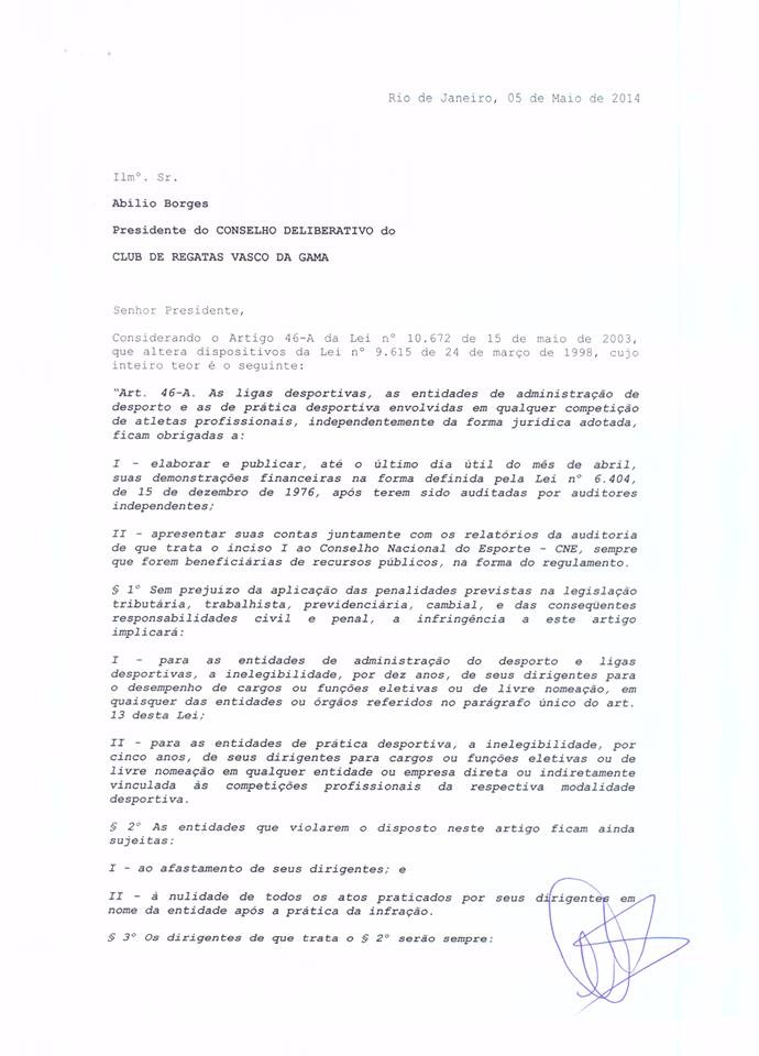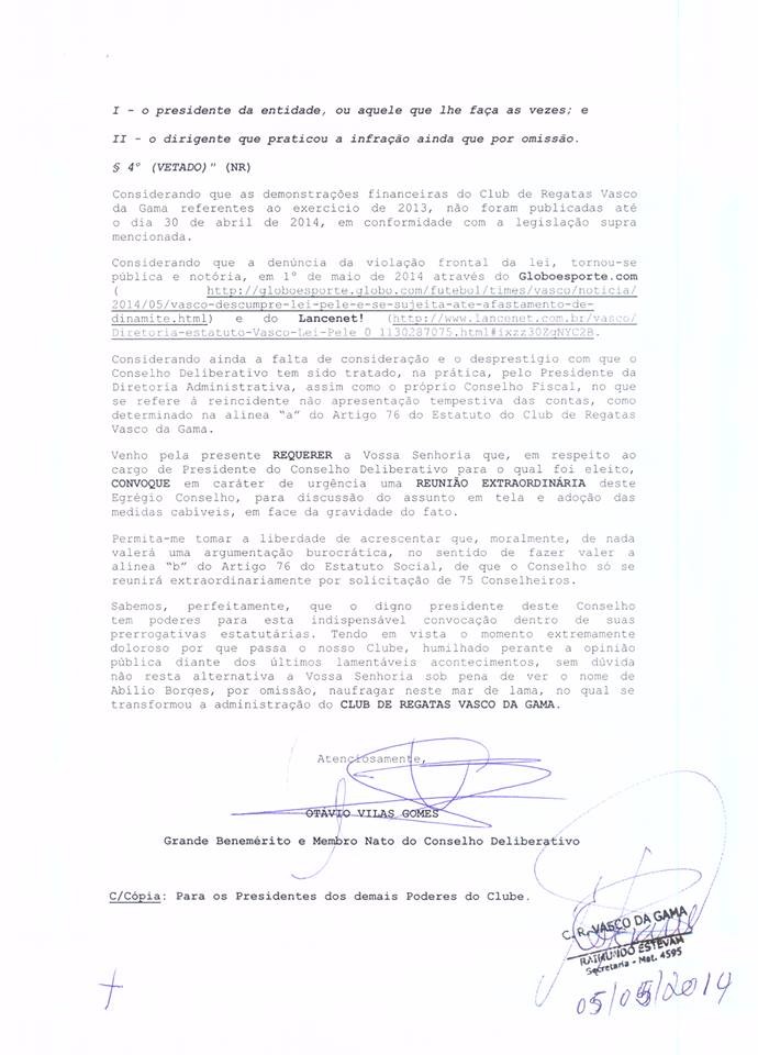 Grande benemérito Otávio Gomes pede que Abílio convoque o CD para tratar do atraso na publicação do balanço de 2013