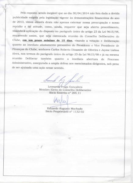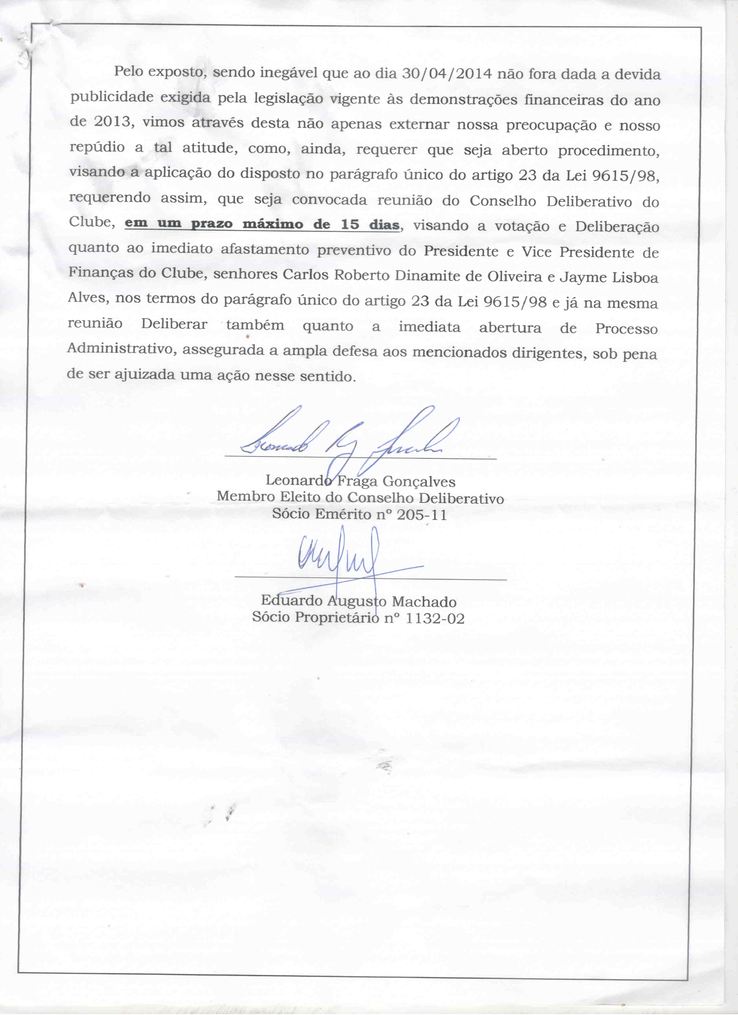 Leonardo Gonçalves e Eduardo Machado pedem que Abílio convoque CD para destituir Dinamite devido a atraso na publicação do balanço 2013