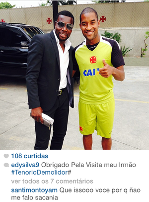 O treino do Vasco nesta sexta-feira foi marcado por uma visita especial. O equatoriano Carlos Tenório, que defendeu o clube entre 2012 e 2013, apareceu de surpresa para rever os ex-companheiros. A presença do atacante não era esperada e passou desapercebida por alguns funcionários do clube e até por jogadores do elenco. Prova disso é a foto postada pelo atacante Edmílson em uma rede social. Logo abaixo da imagem, o colombiano Montoya reclama nos comentários de não ter visto Tenório.