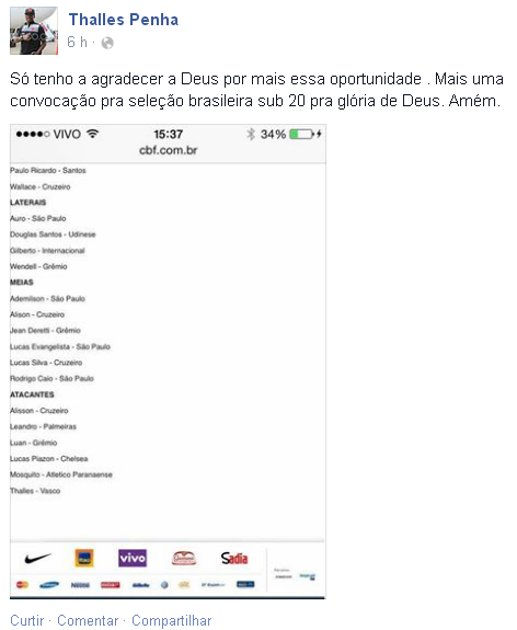 No Facebook, o atacante vascaíno Thalles comemorou sua convocação para a Seleção Brasileira Sub-21 que disputará o Torneio de Toulon: