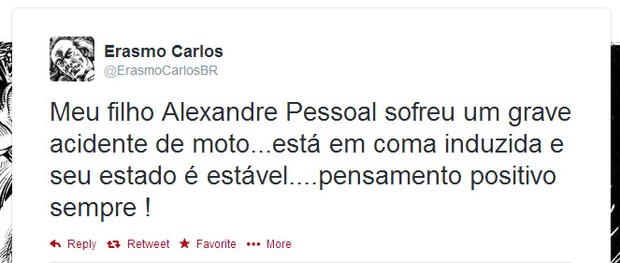 "Meu filho Alexandre Pessoal sofreu um grave acidente de moto... ele está em coma induzido e seu estado é estável... Pensamento positivo sempre! Força meu filho, seu pai estará com você sempre", escreveu Erasmo neste sábado, 10, para os seus fãs e seguidores de uma rede social.
