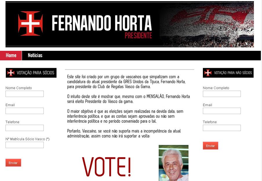 O vascaíno Luís Antônio Pereira criou um site para reunir simpatizantes da candidatura de Fernando Horta à presidência do Vasco da Gama. Horta, atual mandatário da escola de samba Unidos da Tijuca, ainda não confirmou nem descartou que vá concorrer nas eleições vascaínas, que acontecerão, provavelmente, em julho.