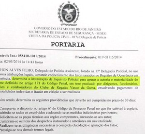 O ofício enviado nessa quinta-feira ao Vasco e recebido nesta sexta pelo presidente da Assembleia Geral diz: "o delegado da 17ª DP, Maurício Luciano, pede ao presidente da Assembleia do Vasco para adiar a data para a escolha do futuro presidente do clube até a conclusão final do presidente inquérito, em virtude das suspeitas que pesam sobre o ingresso irregular de sócios no clube nos meses de março e abril de 2013, pois pode comprometer a legitimidade, a lisura e a igualdade do pleito eleitoral".