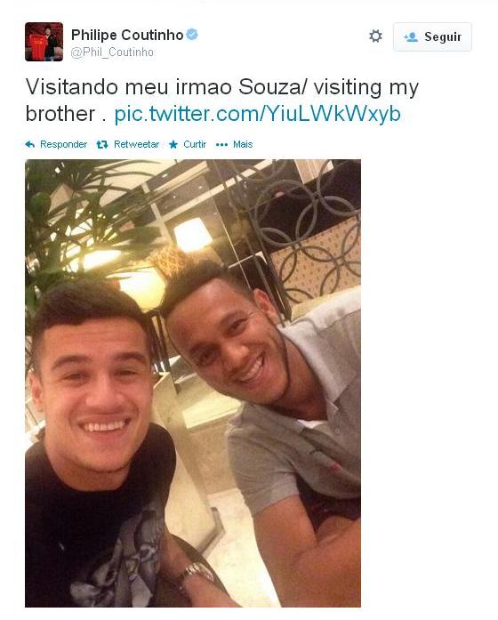 Philippe Coutinho visita 'irmão' Souza e posta no Twitter a foto do encontro de ex-vascaínos