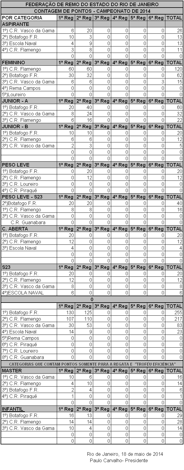 Foi aprovada, pela Comissão de Arbitragem, a 2ª REGATA DO CAMPEONATO ESTADUAL, realizada no dia 18 de de 2014, na Lagoa Rodrigo de Freitas cujo o resultado foi o seguinte: