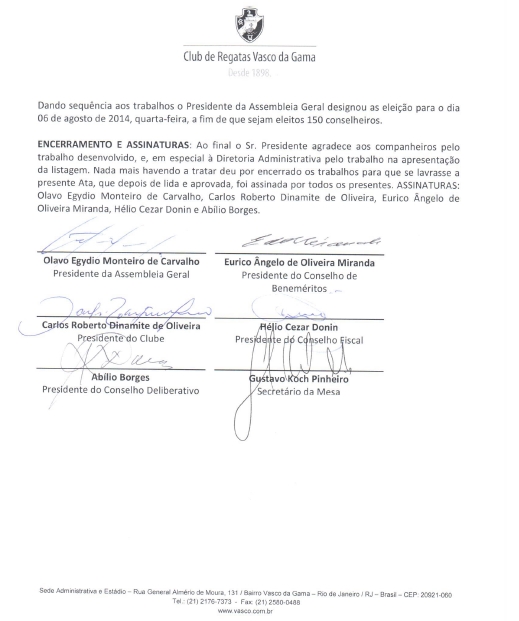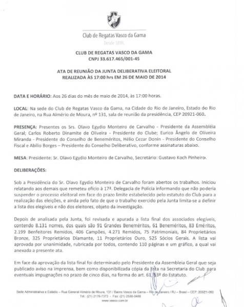 No final da tarde desta segunda-feira (26/05), a Junta Eleitoral reuniu-se e aprovou a lista de sócios elegíveis e designou a data da próxima eleição para o dia 6 de agosto de 2014, conforme Ata abaixo.