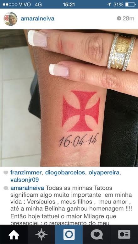 Everton Costa recebeu uma homenagem familiar em forma de tatuagem. Sua esposa Neiva divulgou no Instagram uma imagem de uma cruz de malta no braço com a data do jogo em que o atacante do Vasco passou mal. Everton Costa foi diagnosticado com uma miocardite – inflamação no músculo cardíaco – diante de um quadro de arritmia durante a partida contra o Resende, no último dia 16 de abril, em São Januário. Apesar do otimismo do atleta em retornar ao gramado, a decisão, no entanto, só será tomada em outubro, seis meses após o problema no jogo pela Copa do Brasil.