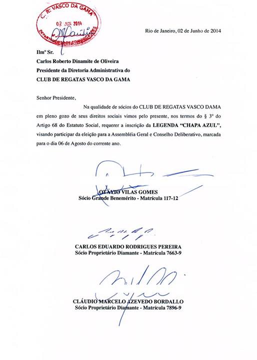 O grande benemérito do Vasco Otávio Gomes protolou na última 2ª-feira (02/06), na secretaria do clube, a inscrição da "Chapa Azul" para concorrer às eleições para o Conselho Deliberativo vascaíno, que estão marcadas para 6 de agosto. Também assinam o requerimento os sócios Carlos Eduardo Rodrigues Pereira e Cláudio Marcelo Azevedo Bordallo.