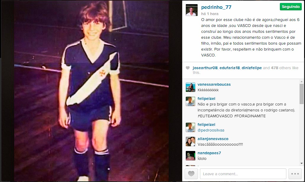 O texto aparece legendando uma foto de Pedrinho com a camisa do clube ainda quando criança. Nos comentários, os torcedores pedem uma mobilização para salvar o Vasco, que disputa a segunda divisão e sofre com problemas financeiros.