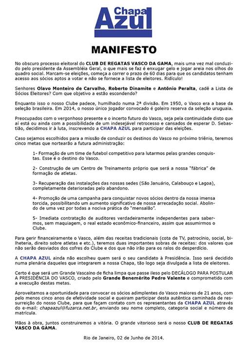 Chapa Azul, de Otávio Gomes, divulga manifesto e esclarece que lançará candidato à presidência do Vasco