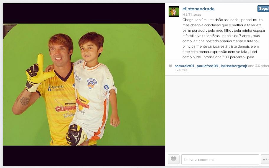 "Chegou ao fim , rescisão assinada , pensei muito mas chego a conclusão que o melhor a fazer era parar por aqui , pelo meu filho , pela minha esposa e família voltei ao Brasil depois de 7 anos , mas como já tinha postado anteriormente o futebol principalmente carioca está triste demais e em time com menor expressão nem se fala , lutei como pude , profissional 100 porcento , pela imprensa fiquei entre os três melhores goleiros do carioca , aceitei jogar a série C mesmo depois de ter passado pela champions league e isso não me diminui nem um pouco e com esse pensamento vinha sendo sempre pela imprensa destaque da equipe , mas como sempre disse não sou tenista , não pratico esporte individual e remo sempre junto com o grupo , agradeço meus companheiros , podem contar comigo , agradeço meu treinador de goleiros Ricardo Barros , e meus companheiros de posição , raphael Mello , Bernardo casanova e Bruno Rodriguez , vou sentir saudades , Luis Paulo treinador que terá sua chance e aos que passaram Alexandre gama , Eduardo allax e para os que eu não citei fica meu muito obrigado , #vamosduque muito obrigado sempre me apoiando , enfim boa sorte a todos , vida que segue e não posso compactuar com tanto erro , são 20 anos de carreira pra ter que lidar com alguns amadores e pessoas com um só objetivo Eles próprios , poderia escrever até amanhã mas paro por aqui me despedindo de um clube que me trouxe em 2007 minha ida pra Europa e em 2014 a chance de voltar ao Brasil por opção familiar e tudo indicando que a volta pra Europa será o destino , seja o que Deus quiser e pronto sempre estarei , decisão tomada e sempre levando algo positivo , lutem sempre pois com a nossa realidade carioca e de time menor a tendência é so afundar , fiquem com Deus e meu sempre obrigado"