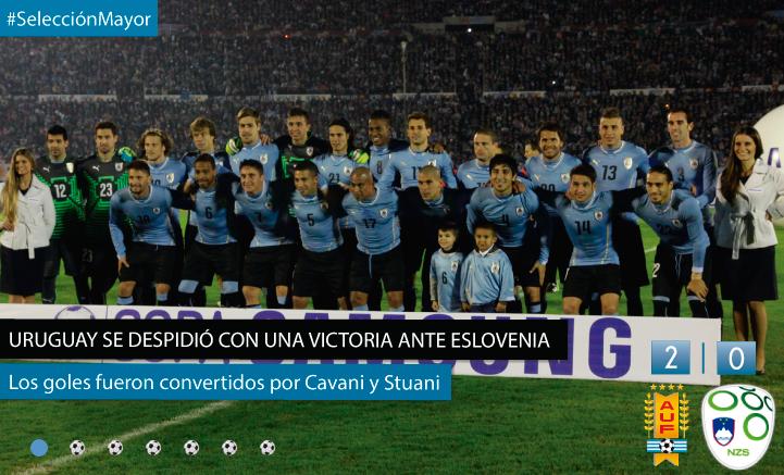 El miércoles por la noche Uruguay disputó su último partido amistoso previo al Mundial. La selección venció 2 – 0 a Eslovenia en el estadio Centenario. Los goles fueron convertidos por Edinson Cavani a los 36 minutos del primer tiempo y de Cristhian Stuani a los 31 minutos del complemento.