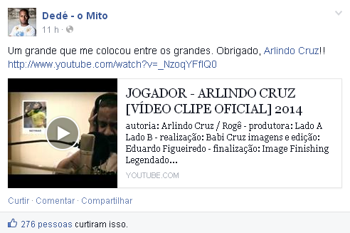 O ídolo vascaíno Dedé, hoje no Cruzeiro, recebeu uma citação na música "Jogador", do sambista Arlindo Cruz, figurando ao lado de grandes nomes do futebol brasileiro como Pelé, Garrincha, Didi, Romário e Ronaldo. Em seu Facebook, o "Mito" agradeceu a homenagem.