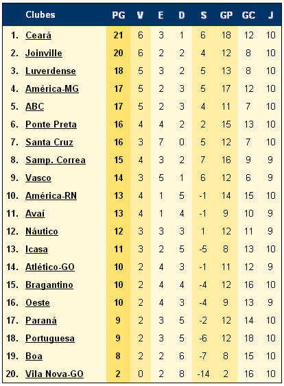 Os resultados desta 6ª-feira (06/06) pela 10ª rodada (Joinville 1 x 0 Vila Nova e Paraná 0 x 2 Luverdense) não tiveram influência na colocação do Vasco na classificação do campeonato. A 10ª rodada ainda tem um jogo pendente: Atlético-PR x Oeste, que será no dia 22/07.