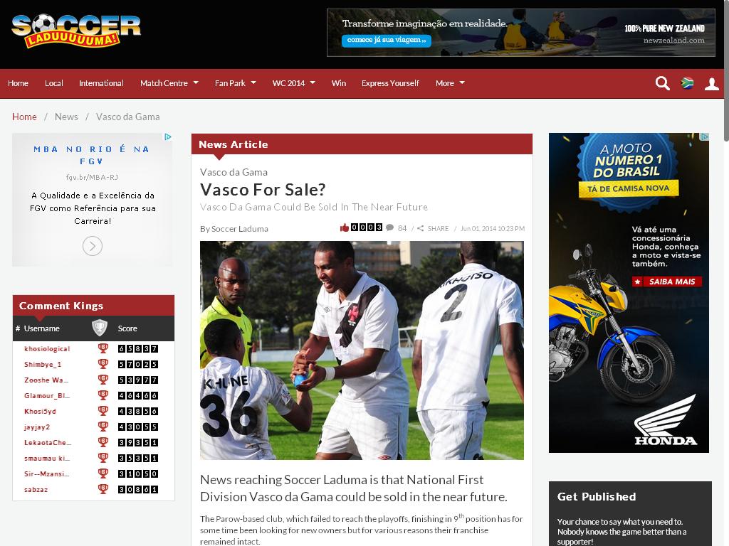 A manchete e a foto podem assustar o vascaíno mais distraído: "Vasco for sale?" ("Vasco à venda?", em inglês). A notícia, porém, se refere ao "xará" cruz-maltino na África do Sul, também chamado Club de Regatas Vasco da Gama. A matéria, publicada pela versão online da revista sul-africana Soccer Laduma, dá conta de que o clube pode ser posto à venda num futuro próximo. Fundado em 1980, o Vasco da África do Sul foi tema de diversas reportagens na época da Copa de 2010. Atualmente, disputa a 2ª divisão do país.