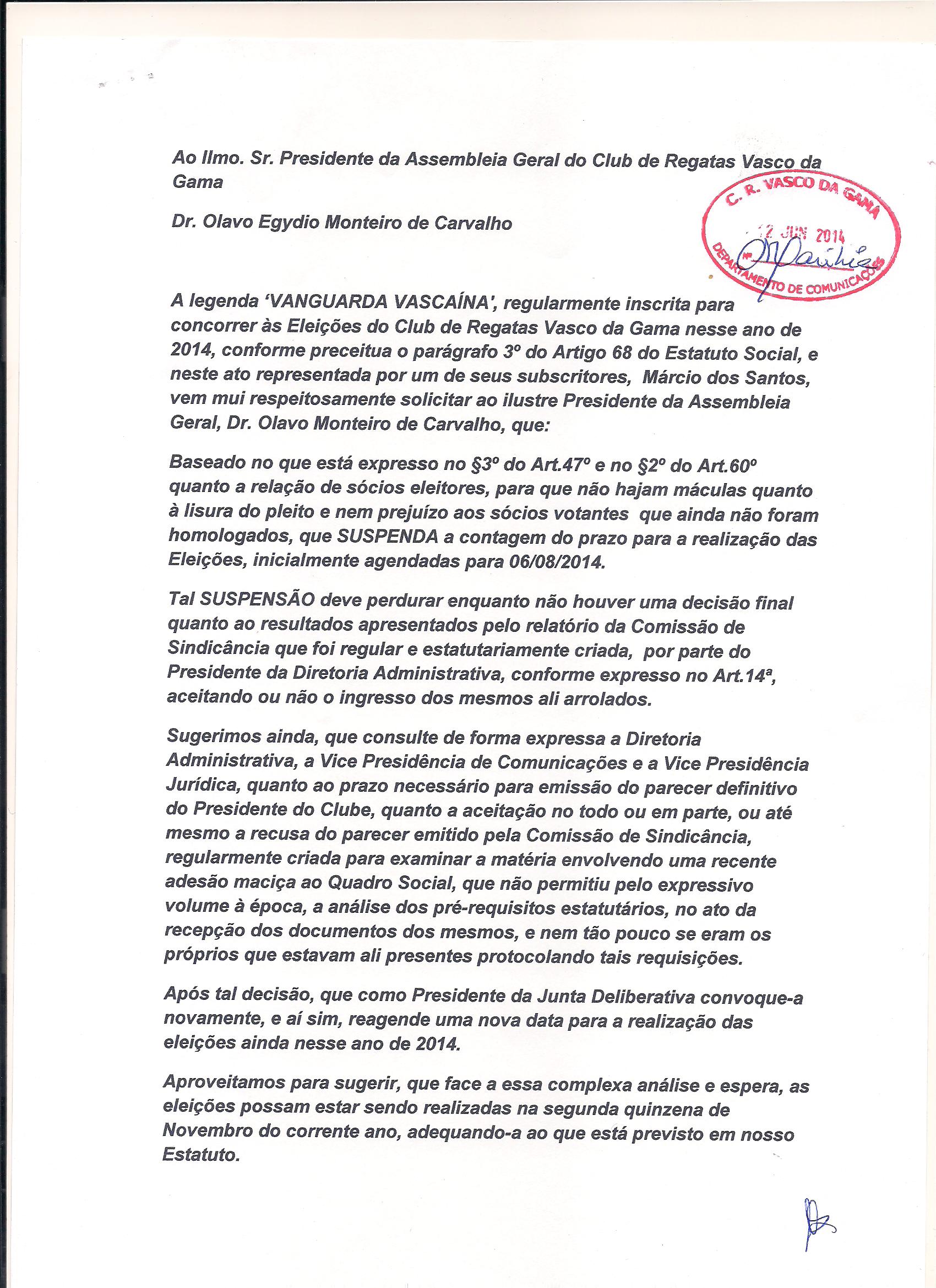 Chapa Vanguarda Vascaína pede a Olavo que adie as eleições do Vasco