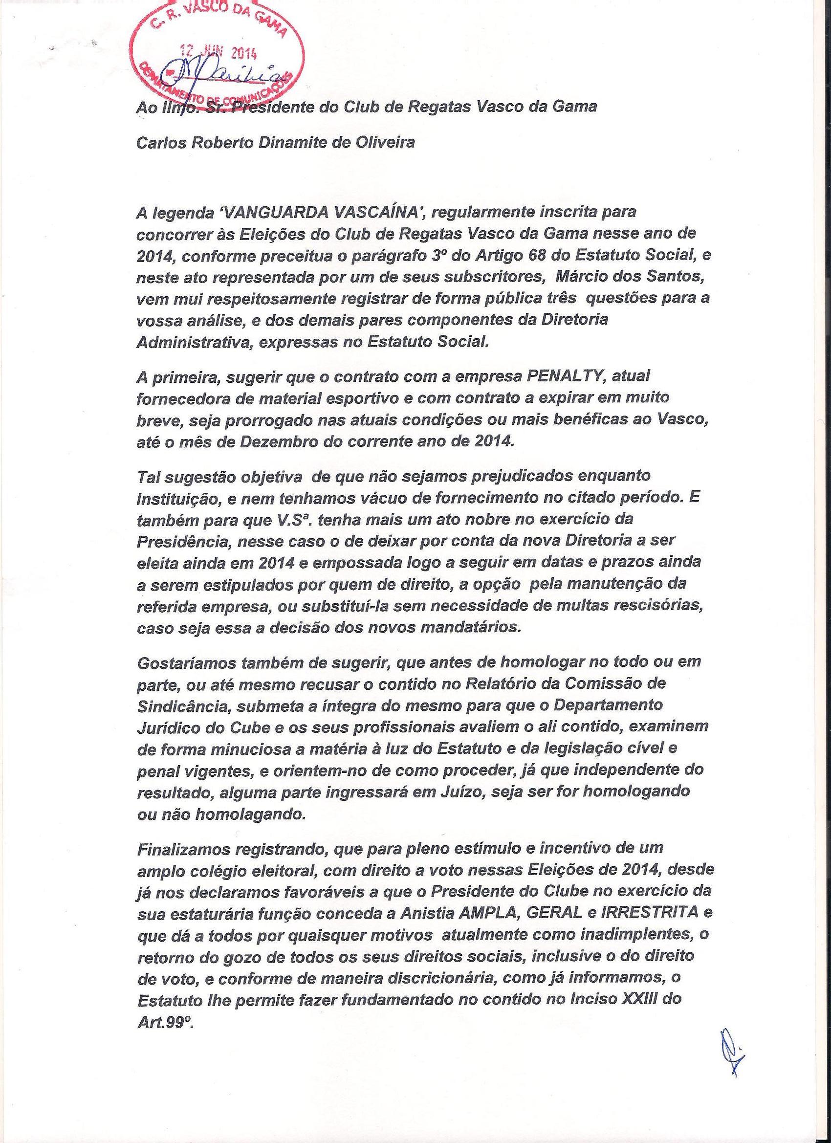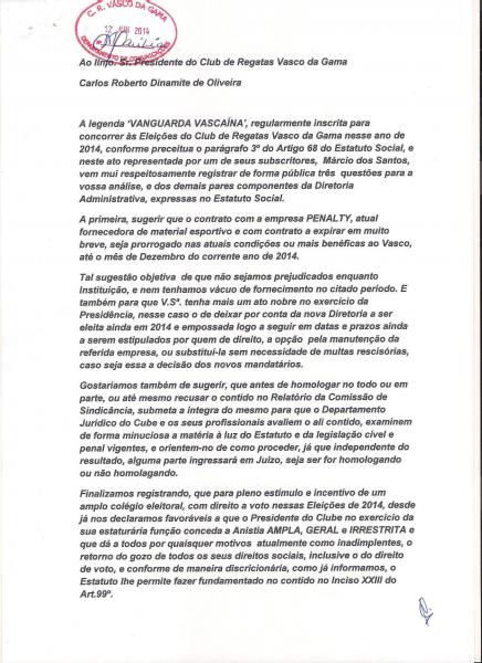 Chapa Vanguarda Vascaína pede a Dinamite que renove com a Penalty até dezembro e que conceda anistia a sócios
