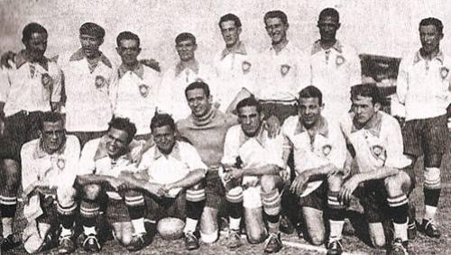 Seleção Brasileira em 1930: Brilhante, Fernando, Hermógenes, Nilo, Carvalho Leite, Itália, Fausto e Santana; ajoelhados vemos Teóphilo, Benevenuto, Benedito, Velloso, Doca, Russinho e Preguinho.
