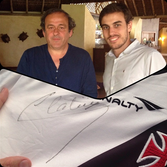 Que honra encontrar esse ícone do futebol mundial. Entreguei uma camisa do Vasco e me disse que seria a segunda dele, ja que em 82 ele comprou uma. #Platini #Vasco