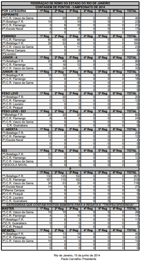 Foi aprovada, pela Comissão de Arbitragem, a 3ª REGATA DO CAMPEONATO ESTADUAL, realizada no dia 15 de junho de 2014, na Lagoa Rodrigo de Freitas cujo o resultado foi o seguinte:
