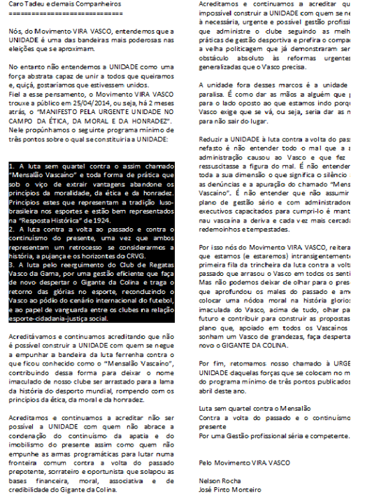 Fiel a esse pensamento, o Movimento VIRA VASCO trouxe a público em 25/04/2014, ou seja, há 2 meses atrás, o “MANIFESTO PELA URGENTE UNIDADE NO CAMPO DA ÉTICA, DA MORAL E DA HONRADEZ”. Nele propúnhamos o seguinte programa mínimo de três pontos sobre o qual se constituiria a UNIDADE: